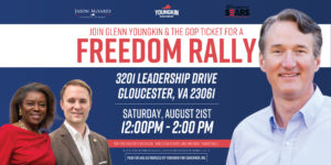 Glenn Younkin and the rest of the statewide ticket will be visiting Gloucester for a Freedom Rally this Saturday, August 21 at noon. The event will take place at The Gloucester Institute. The event will be private but free, and we fully expect to max out attendance, so it is very important that those interested in coming RSVP here – https://www.eventbrite.com/